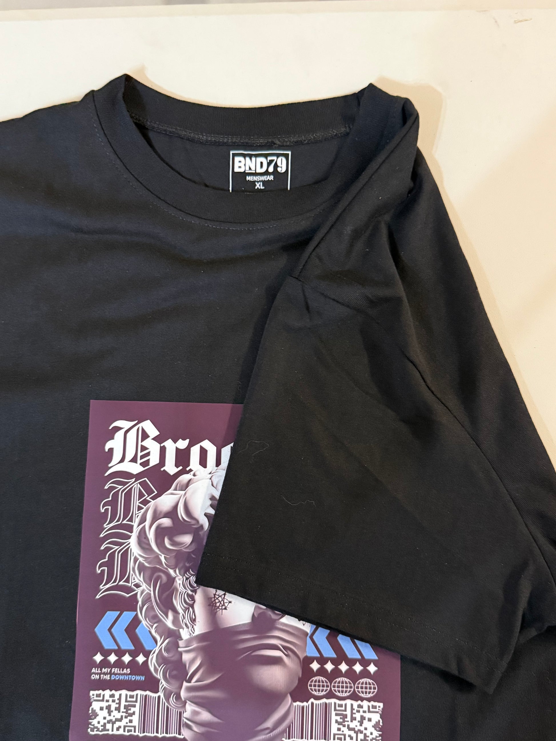 Make a bold statement with this cotton t-shirt! It features a striking graphic of a masked, tattooed statue of Davidwith "Brooklyn" text. Below the art, the defiant mantra "F*ck The Rules" is printed. This tee is the ultimate expression of rebellious streetwear style.