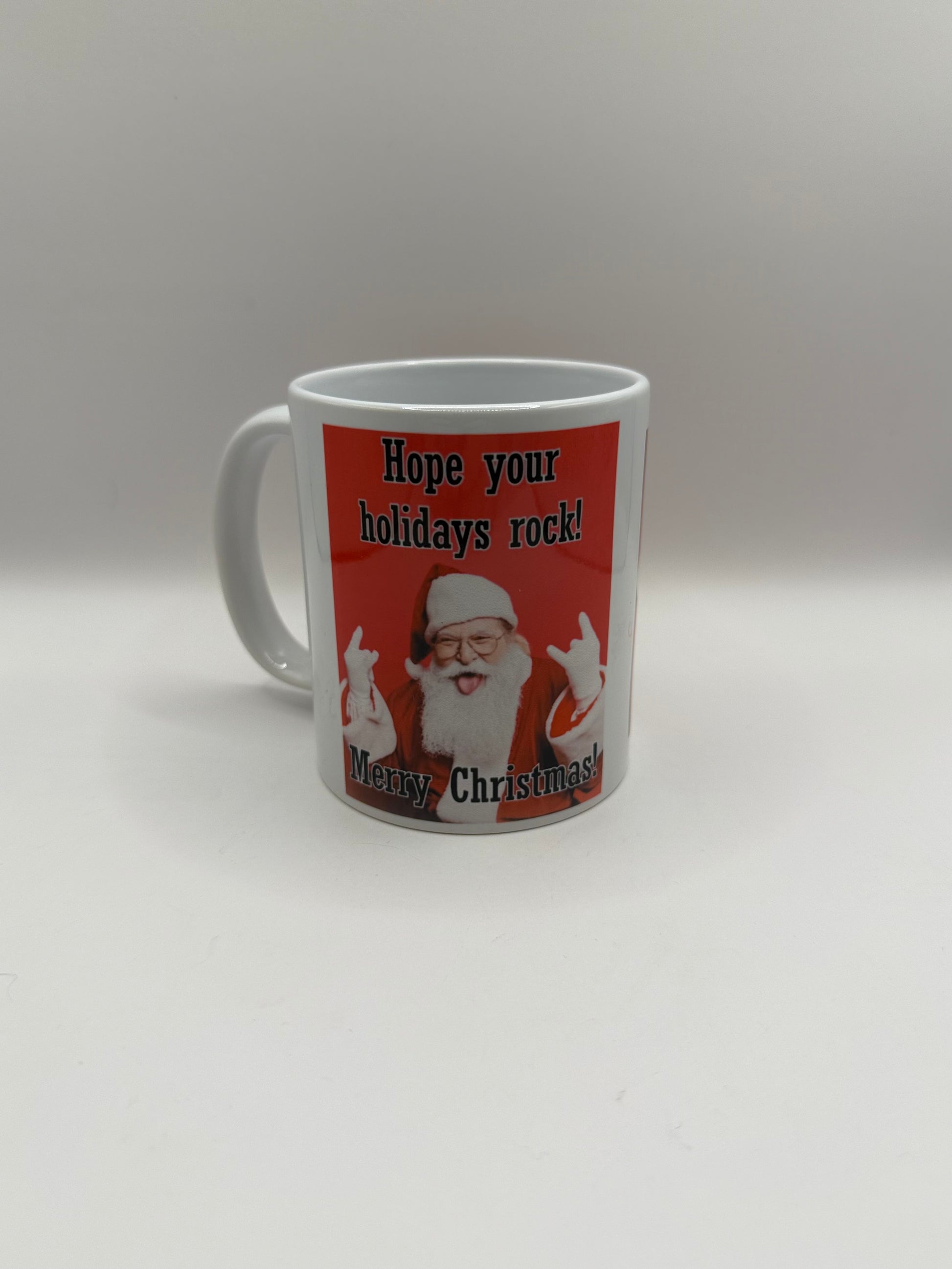 This festive mug brings the fun with a twist! One side features a rocking Santa Claus throwing up "rock on" hand signs with the message, "Hope your holidays rock!" and "Merry Christmas!" The reverse side has a bright red holiday design with "Merry Christmas" text and bells. Perfect for the rebel with holiday spirit!